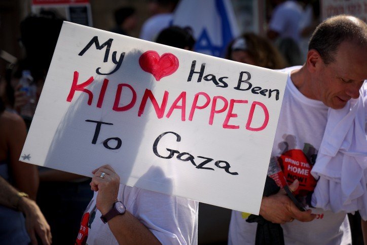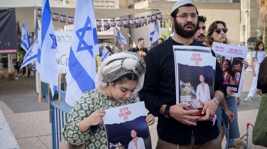 Inwoners en sympathisanten van Kfar Aza eisen de vrijlating van Israëli’s die gegijzeld worden door terroristen van Hamas in Gaza.Foto: Jonathan Shaul/Flash90