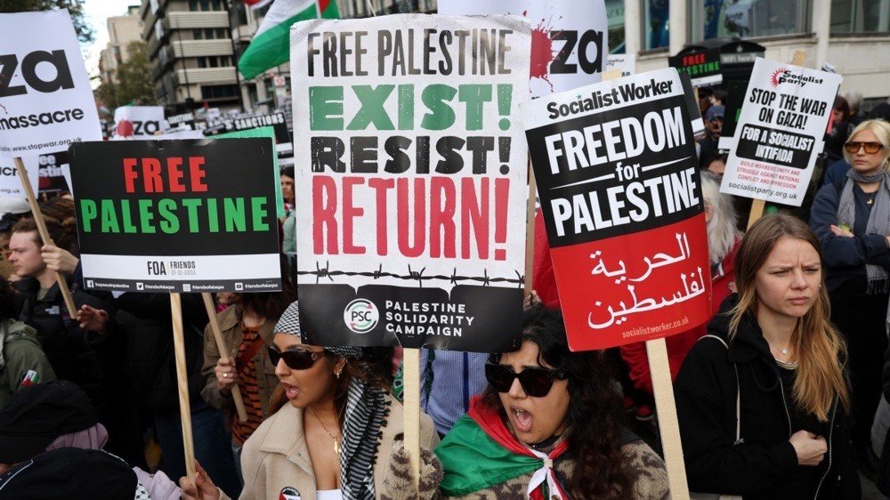 Pro-Palestijnse demonstranten in Londen op 21 oktober 2023. Foto door EPA-EFE/ANDY RAIN