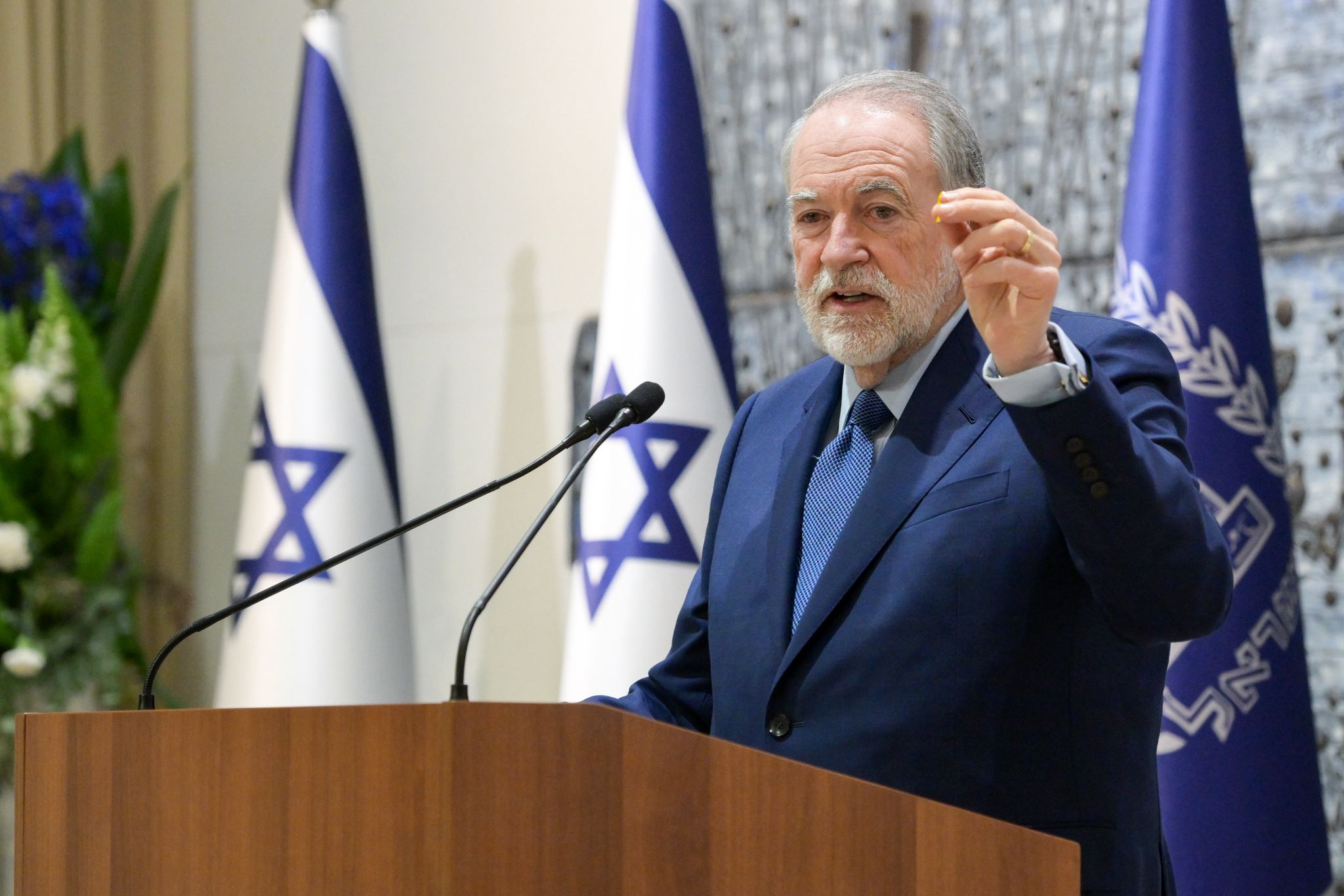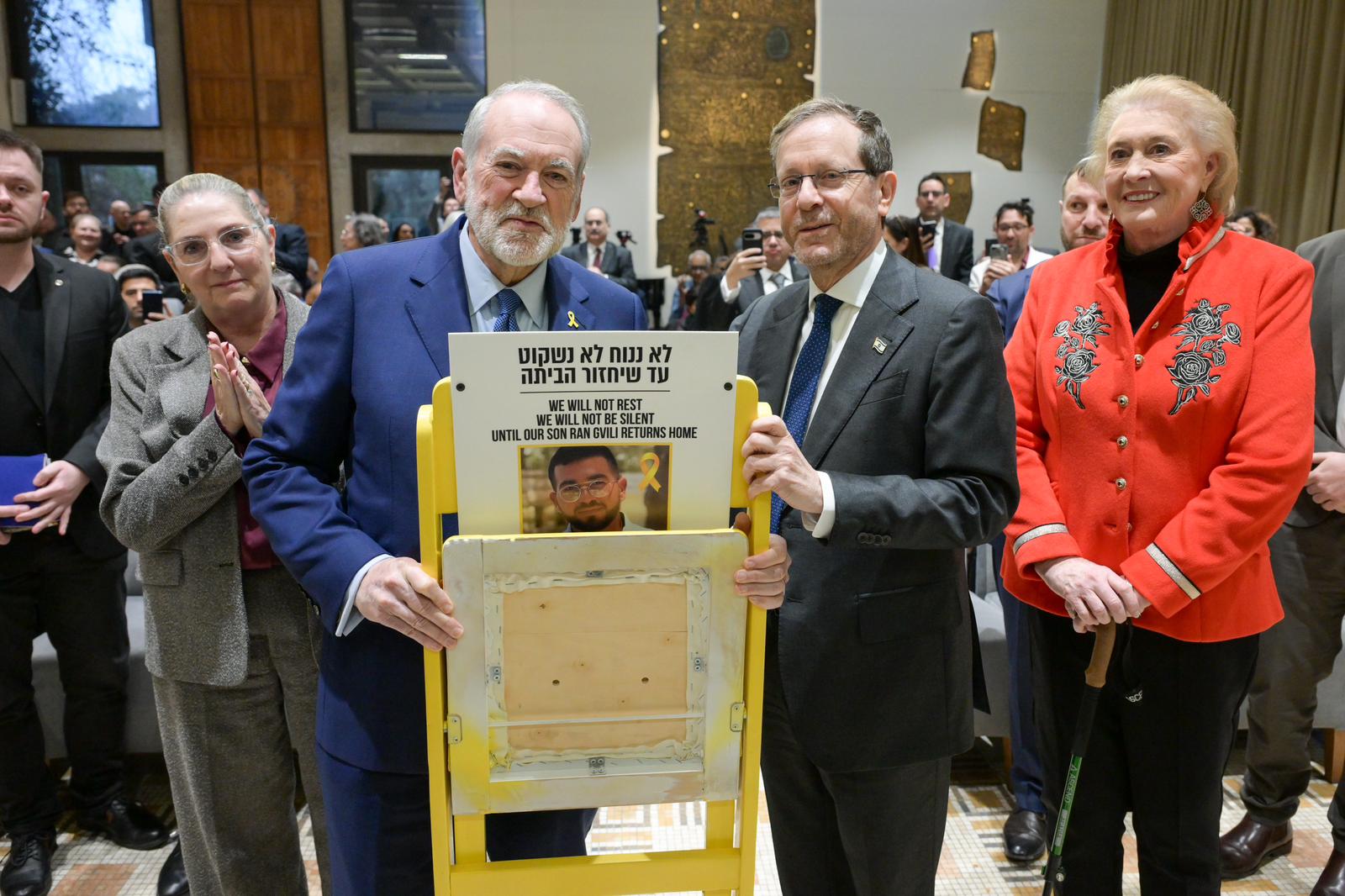 Tijdens het evenement sprak ook de Amerikaanse ambassadeur Mike Huckabee, die erop wees dat het een “buitengewoon voorrecht” was om eindelijk de gele gijzelaars-speld af te doen die hij, net als zoveel anderen, twee jaar lang op zijn revers had gedragen.