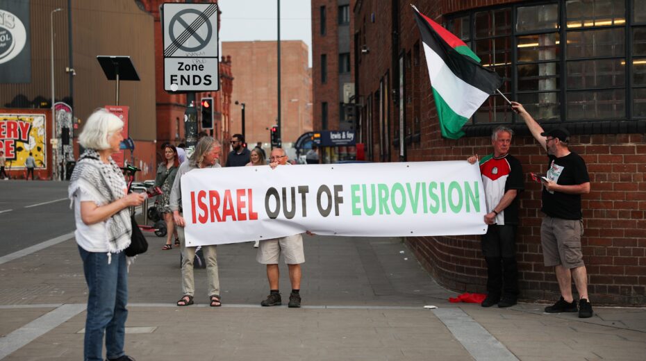 Protest tegen de deelname van Israël aan het Eurovisiesongfestival in Liverpool, 11 mei 2024. Demonstranten met Palestijnse vlaggen en een spandoek met de tekst “Israel out of Eurovision” voor de locatie Camp and Furnace. Foto: EPA/ADAM VAUGHAN