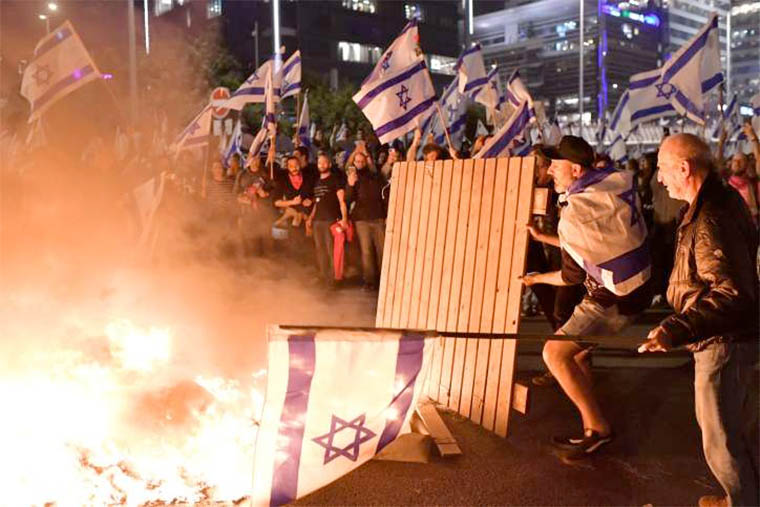 De landelijke protesten, waarbij demonstranten een hoofdweg in Tel Aviv blokkeerden, brand stichtten en buiten de residentie van de premier in Jeruzalem met waterkanonnen werden beantwoord, vormden het einde van de eerste dag van een geplande reeks demonstraties van een week tegen de regering.