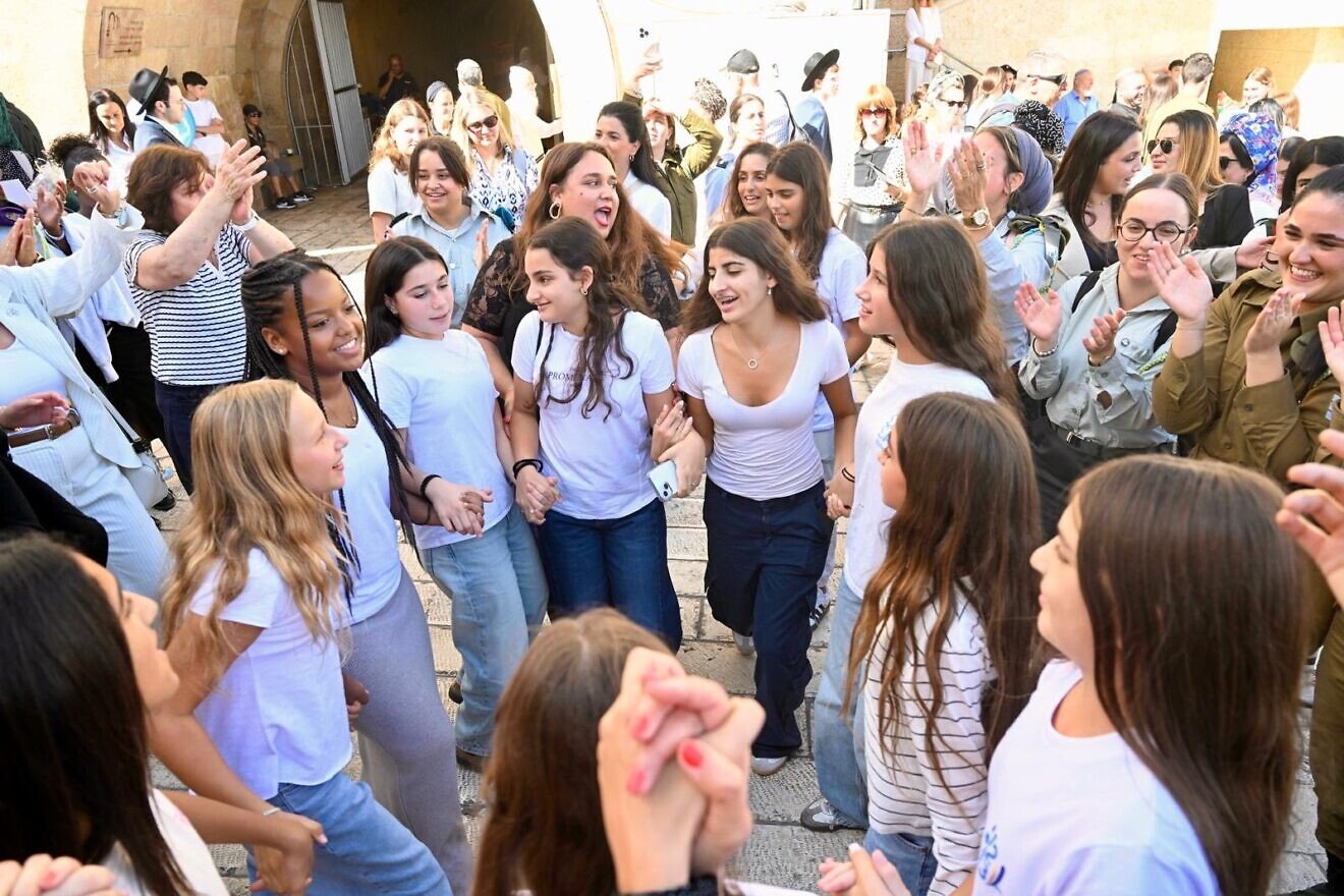 Bat Mitswa-meisjes dansen op het Kotelplein op weg naar een challah-bakactiviteit in het Western Wall Heritage Center om hun B’not Mitswa te vieren. Foto: IDFWO.