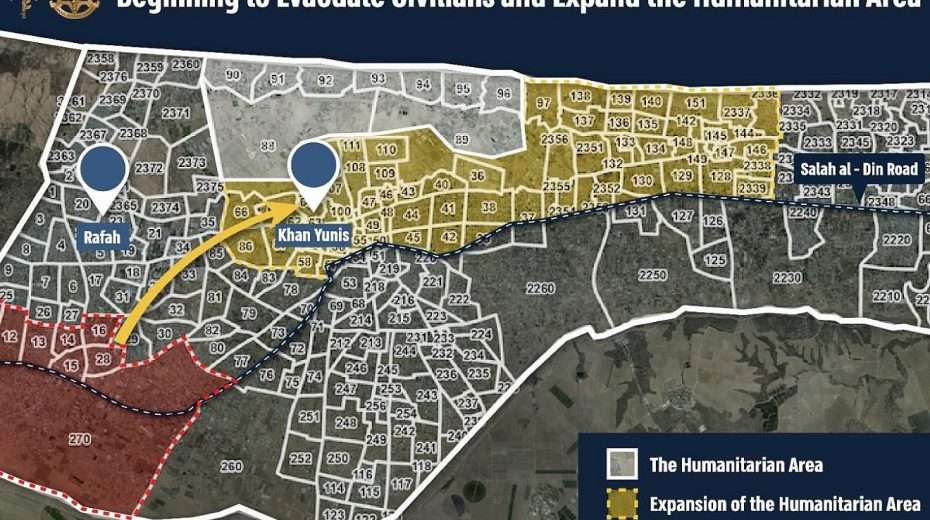 Het Israëlische leger heeft twee evacuatiezones afgebakend: een uitbreiding van de Al-Mawasi-zone langs de centrale en zuidelijke kust van de Gazastrook en Khan Yunis. In de aankondiging van maandag worden burgers verwezen naar de uitgebreide zone in Al-Mawasi, waar veldhospitalen, tenten en grote hoeveelheden voedsel, water, medicijnen en andere voorraden staan.
