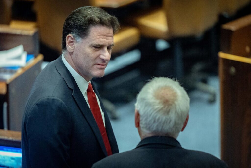 Minister van Strategische Zaken Ron Dermer tijdens een plenaire vergadering in de Knesset in Jeruzalem op 22 januari 2025 Foto: Yonatan Sindel/Flash90.