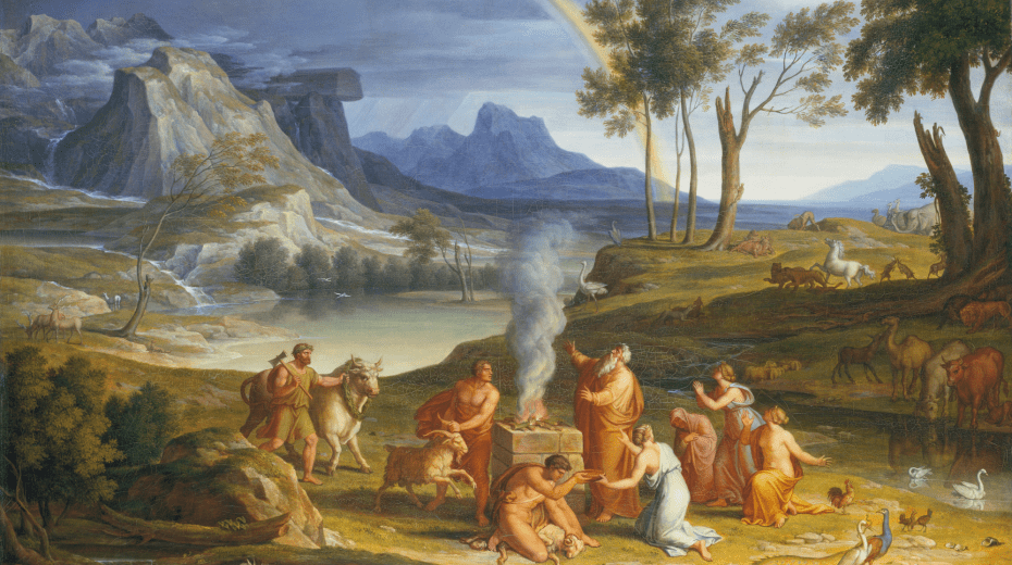 Na de zondvloed van oordeel en vernietiging zwoer God dat hij nooit meer al het leven op aarde zou uitroeien. (Maar God heeft geen garantie dat mensen zichzelf dat niet zullen aandoen). Dan begint God opnieuw. Adam wordt vervangen door Noach, de vader van de “nieuwe” mensheid. Hoofdstuk 9 van Genesis is dus een parallel met hoofdstuk 1 van Genesis.