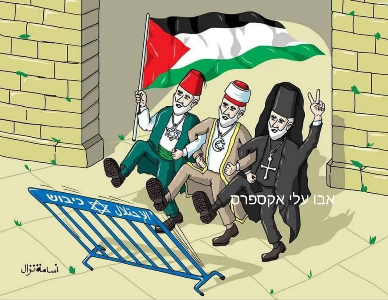 Een karikatuur die op de sociale media-kanalen van Fatah is geplaatst, toont een christen, een moslim en wat een Jood lijkt, die arm in arm door de straten van Jeruzalem marcheren. Met de Palestijnse vlag in de hand wordt een barrière van de politie (“zionistische bezetters”) omver geworpen.