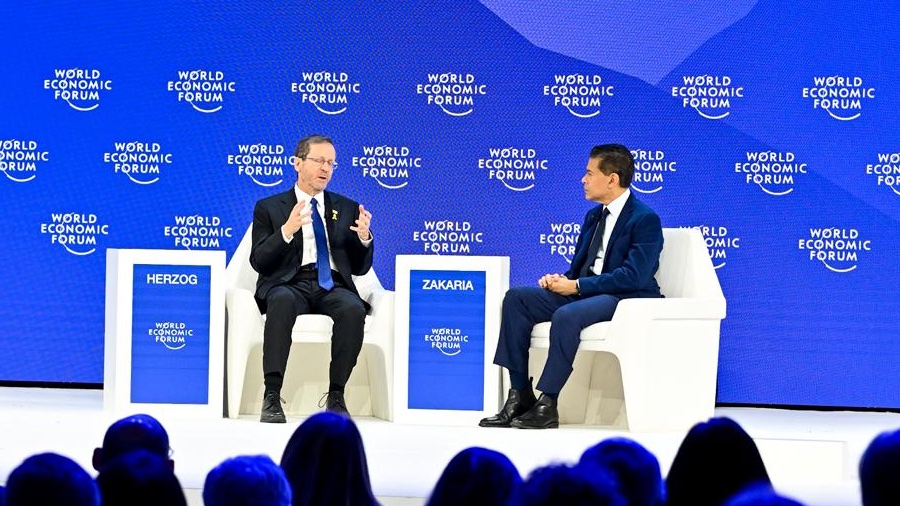 De Israëlische president Isaac Herzog spreekt op 22 januari 2026 op het World Economic Forum in Davos, Zwitserland. Foto: Kobi Gideon/GPO