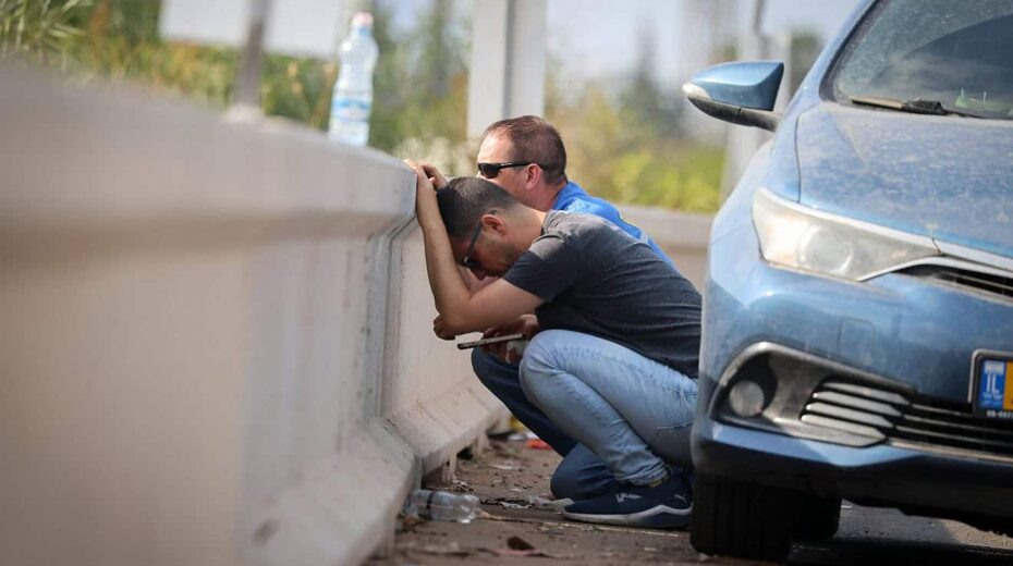 Mensen schuilen in een straat bij Tel Aviv terwijl luchtalarmsirenes waarschuwen voor raketbeschietingen vanuit Hezbollah, 10 oktober 2023. Foto: Yossi Zamir / Flash90