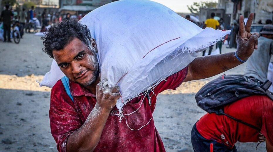 Een Arabische Palestijn draagt een zak meel nadat vrachtwagens met humanitaire hulp op 24 juli 2025 via de door Israël gecontroleerde grensovergang Kerem Shalom Khan Yunis in het zuiden van de Gazastrook hebben bereikt. Foto: Abed Rahim Khatib/Flash90.