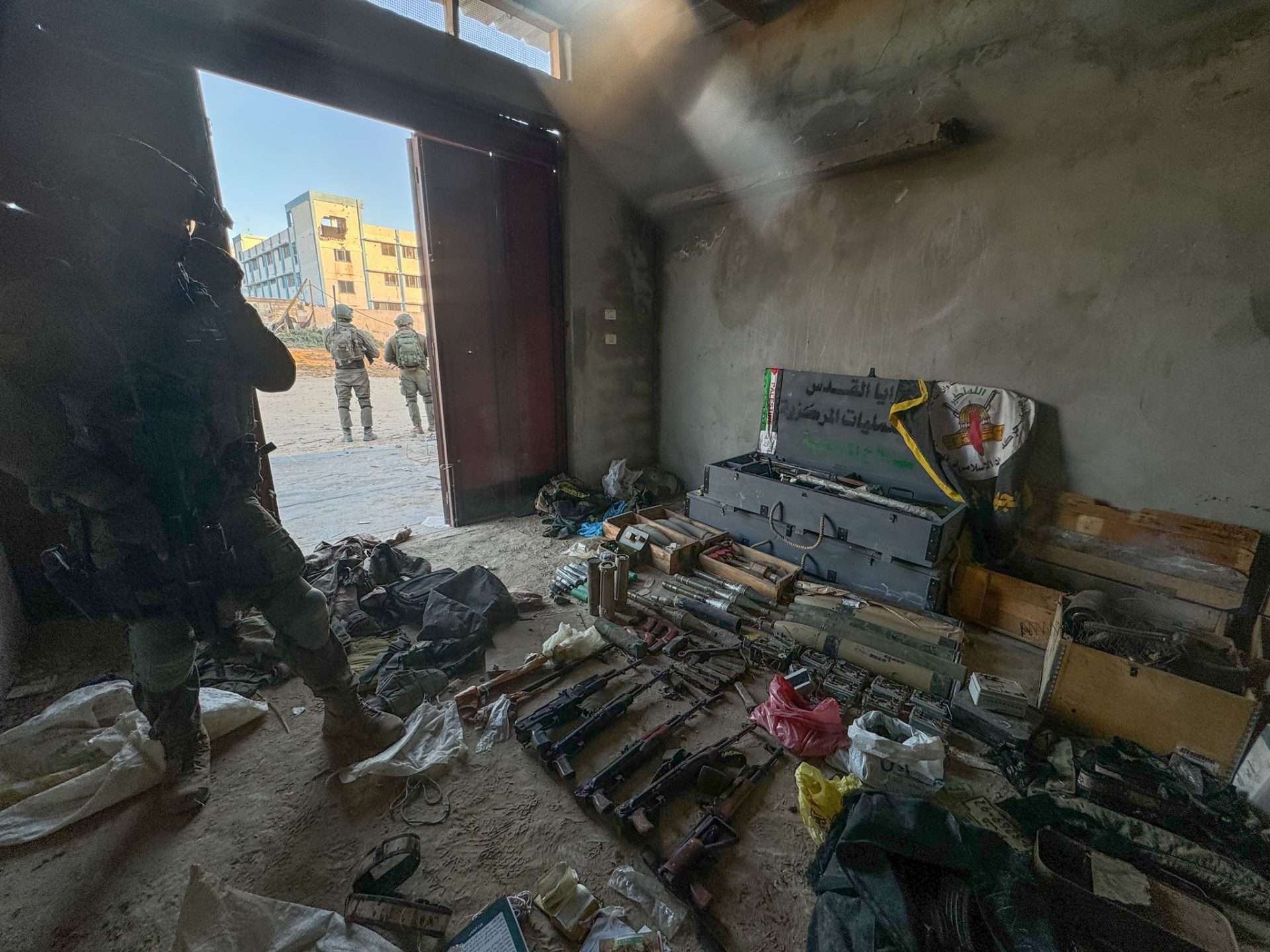 Tijdens invallen door de LOTAR-eenheid op schuilplaatsen en militaire bolwerken van Hamas in woonwijken en op basis van inlichtingen, “doorzochten de strijdkrachten verschillende Hamas-infrastructuren en vonden ze een wapenopslagplaats” in de buurt van de school, voegde het eraan toe.