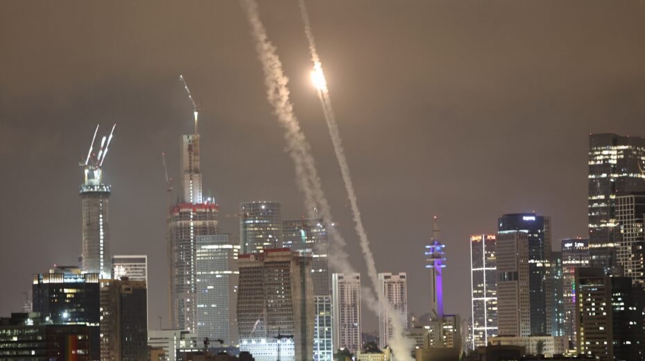 Het Israëlische luchtverdedigingssysteem “Iron Dome” onderschept ballistische raketten die op 15 juni 2025 vanuit Iran over de stad Tel Aviv in Israël zijn afgevuurd. Foto: EPA-EFE/ATEF SAFADI