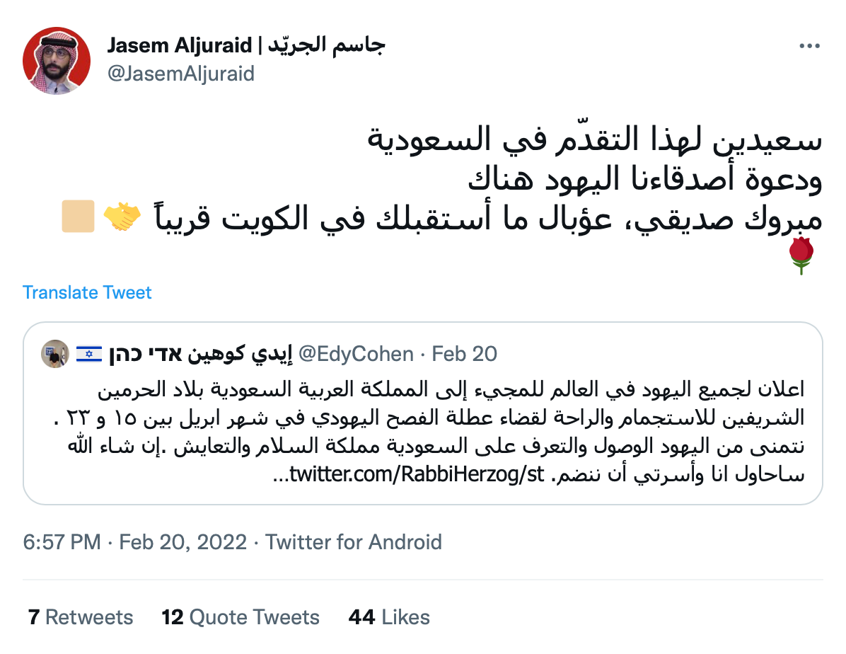 “Wij zijn verheugd over de vooruitgang in Saoedi-Arabië om Joden uit te nodigen. Gefeliciteerd mijn vriend, ik hoop je snel in Koeweit te zien.”