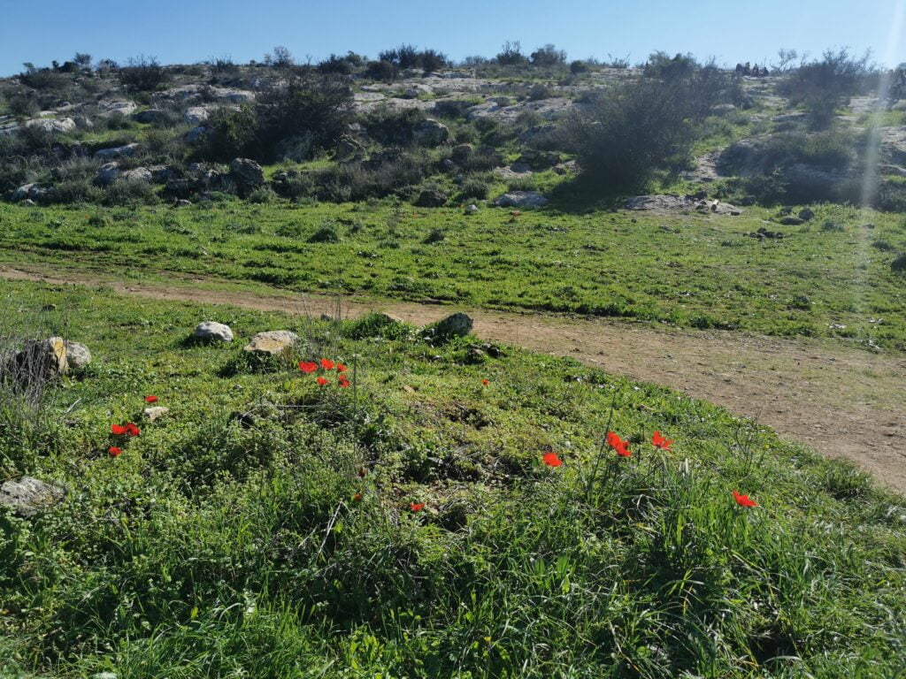 Terwijl gisteren duizenden Israëli’s zich naar het zuiden van het land begaven om de rode anemonen te bewonderen, die nu in bloei staan, deden wij er te voet slechts 5 minuten over om de ‘Zuidelijke Heuvels’ te bereiken. En daar waren ook de rode anemonen te bewonderen. Wij waren trouwens niet de enigen, want intussen schijnt het gerucht de ronde te hebben gedaan dat je hier in Modi’in ook prachtige wandelingen kunt maken.
