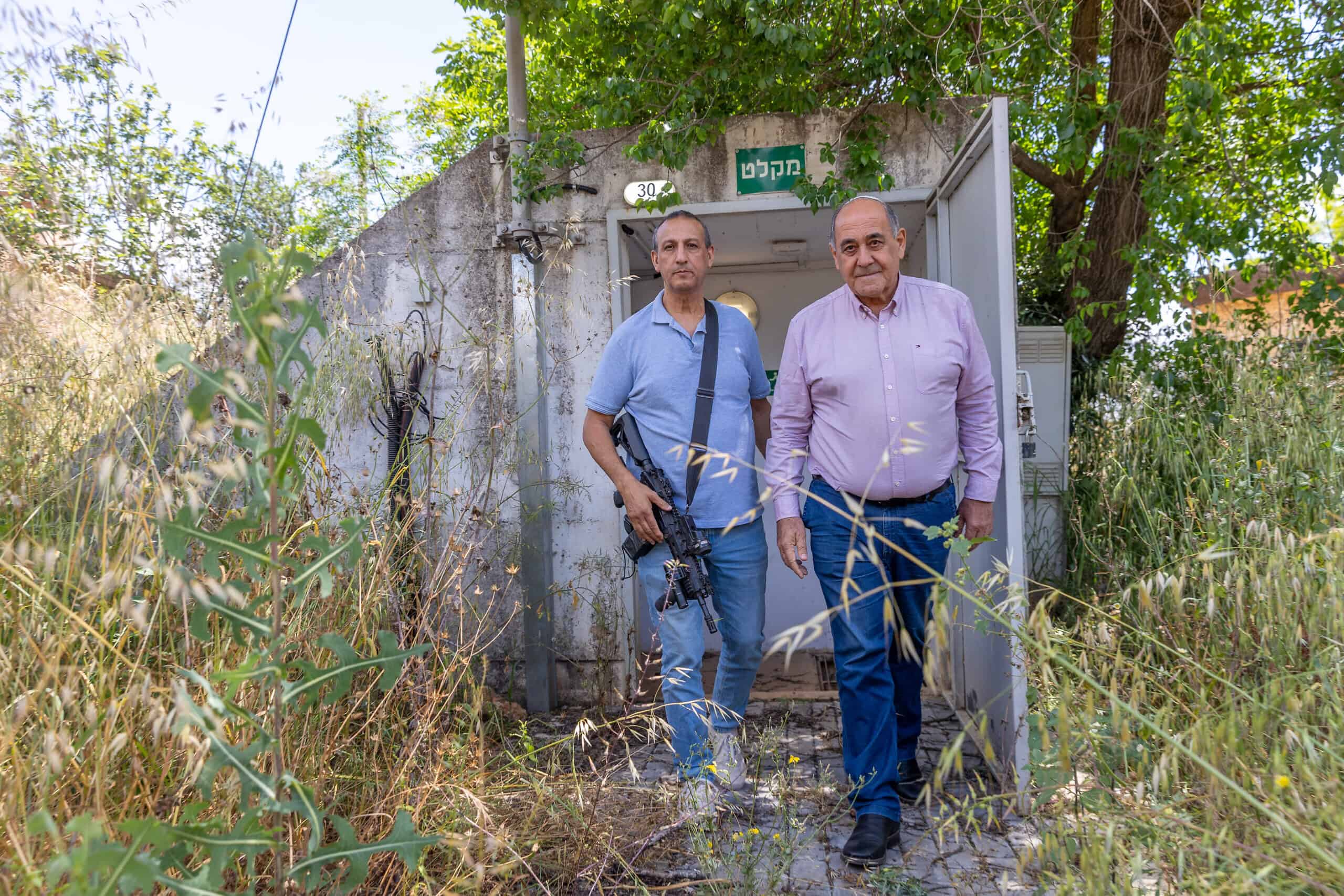 David Azulay, links, voorzitter van de regionale raad van Metula, verlaat een schuilkelder samen met de burgemeester van Shlomi, Gabi Naaman, Metula, Israël, 7 mei 2024. foto door Yossi Aloni/Flash90.