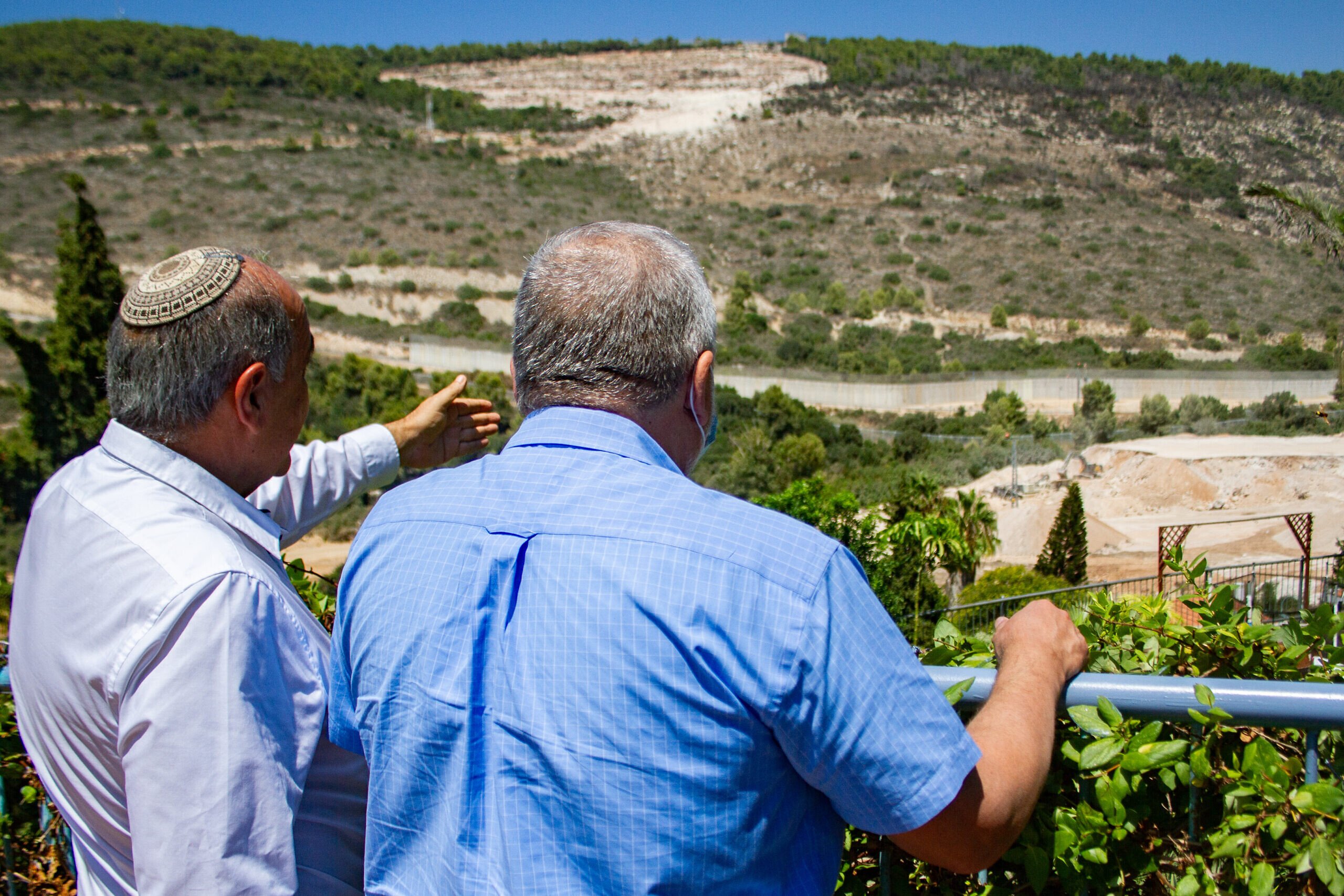 Twee mannen kijken in de richting van Libanon vanuit de stad Shlomi in Israël, 24 augustus 2021. foto door Flash90.