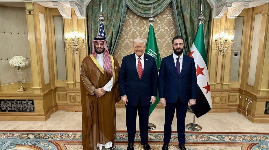 De Amerikaanse president Donald Trump heeft op 14 mei 2025 in Riyad, Saoedi-Arabië, een ontmoeting gehad met de Syrische president Ahmed al-Sharaa en de Saoedische kroonprins Mohammed bin Salman. Bron: @PressSec/X, via JNS.
