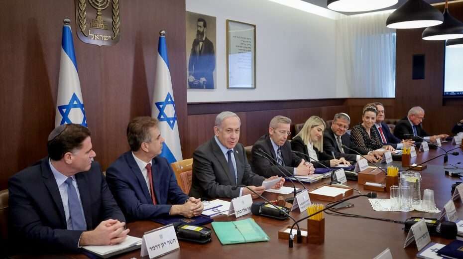 De Israëlische premier Benjamin Netanyahu zit een kabinetsvergadering voor op 17 juli 2023. Foto: Marc Israel Sellem/POOL