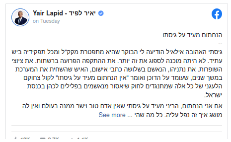 Op zijn beurt gebruikte Lapid Facebook om de dubbelzinnigheid van Netanyahu aan de kaak te stellen, die wijst op de splinter in het oog van een ander terwijl hij de balk in zijn eigen oog negeert (om een van Jezus’ gelijkenissen te gebruiken). Netanyahu is nog steeds aangeklaagd in verschillende corruptiezaken.