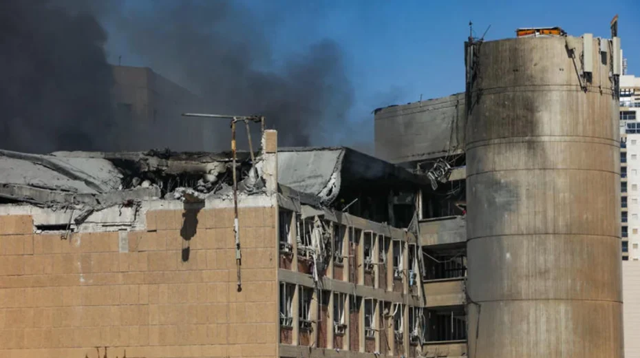 Rook stijgt op vanaf de plek waar op 19 juni 2025 een ballistische raket afgevuurd vanuit Iran het Soroka Medical Center in Beersheba heeft geraakt en beschadigd. Foto: Dudu Greenspan/Flash90.