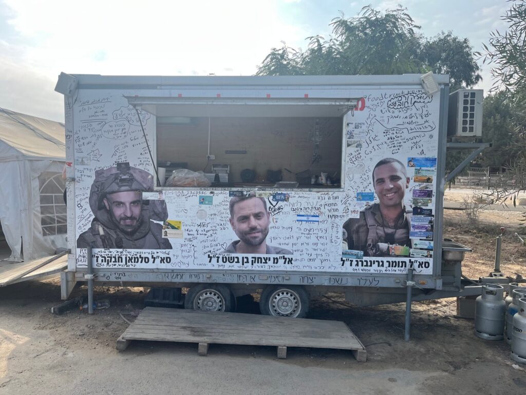 Hij reed langzaam met zijn bestelwagen naar een IDF-post waar troepen de grens in de regio Eshkol beveiligden, en stopte om de soldaten falafel- en shakshuka-broodjes uit te delen. Hij wees naar een tank die op een dieplader werd gesleept en vroeg onze verslaggever: “Ziet u die tank die naar Gaza rijdt? Hoe kun je zeggen dat de oorlog voorbij is, zolang onze soldaten in Gaza zijn en niet thuis?”