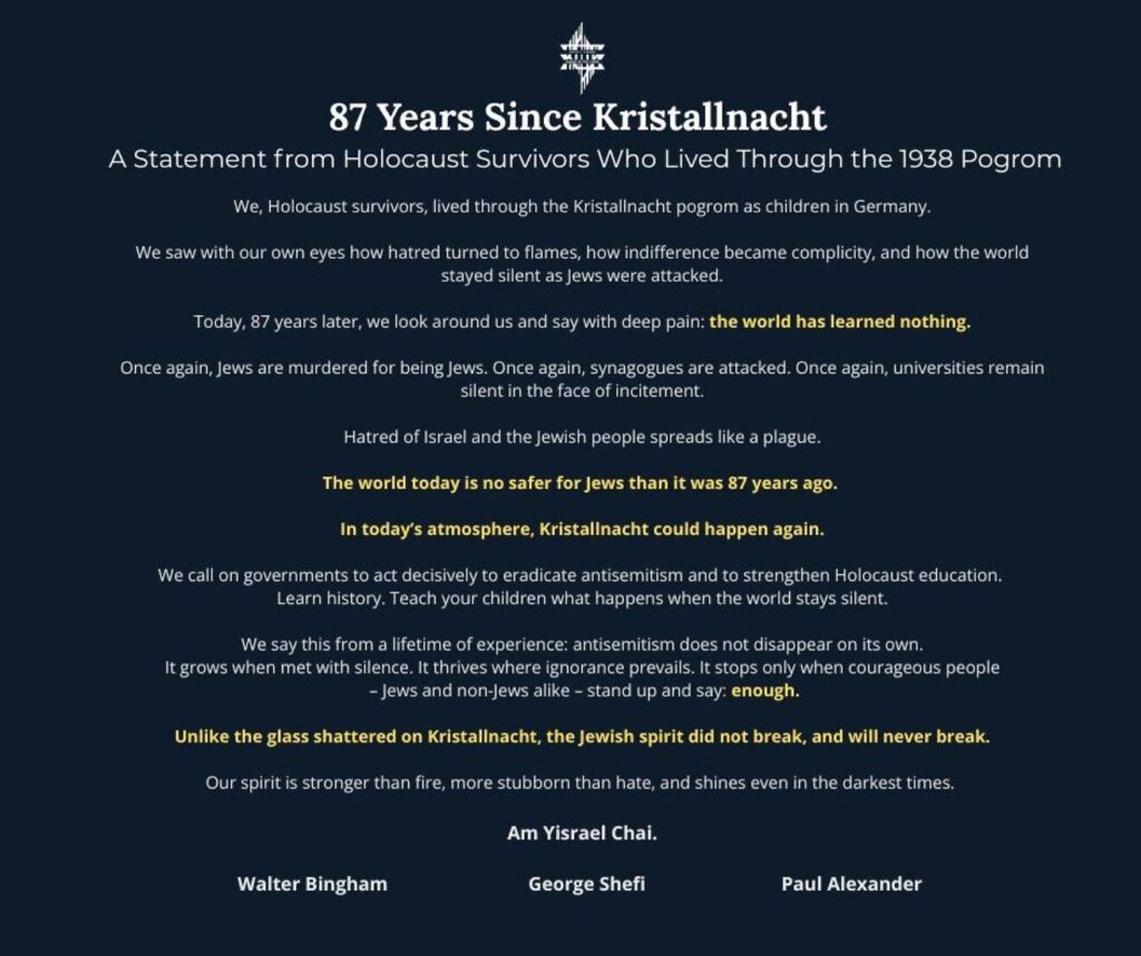 Op de 87e verjaardag van Kristallnacht waarschuwden drie overlevenden van de Holocaust, die als kinderen de beruchte nazi-pogrom in Duitsland in 1938 hadden meegemaakt, dat de wereld vandaag de dag opnieuw gevaarlijk en onveilig is voor joden, en riepen ze regeringen op om krachtige maatregelen te nemen om antisemitisme te bestrijden en de voorlichting over de Holocaust te versterken.