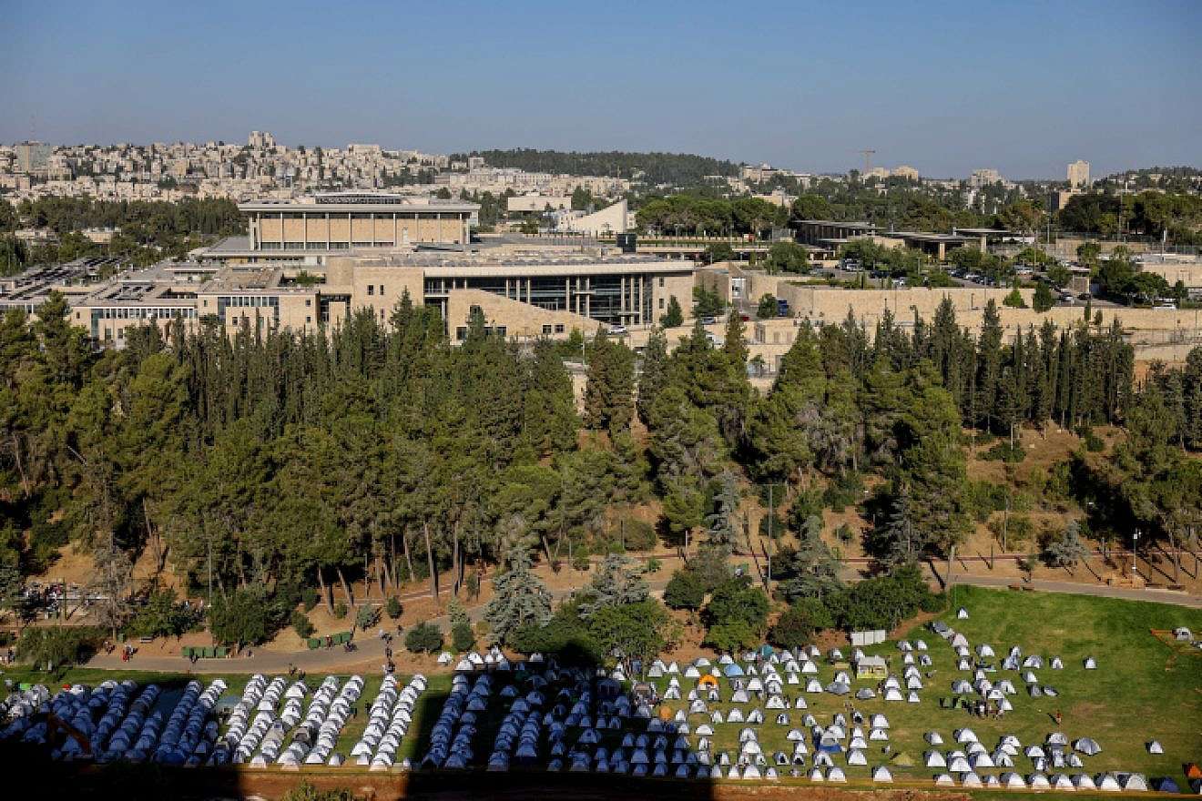 Uitzicht op tenten van anti-hervormingsactivisten en de Knesset, het Israëlische parlement in Jeruzalem, op 23 juli 2023. foto: Chaim Goldberg/Flash90