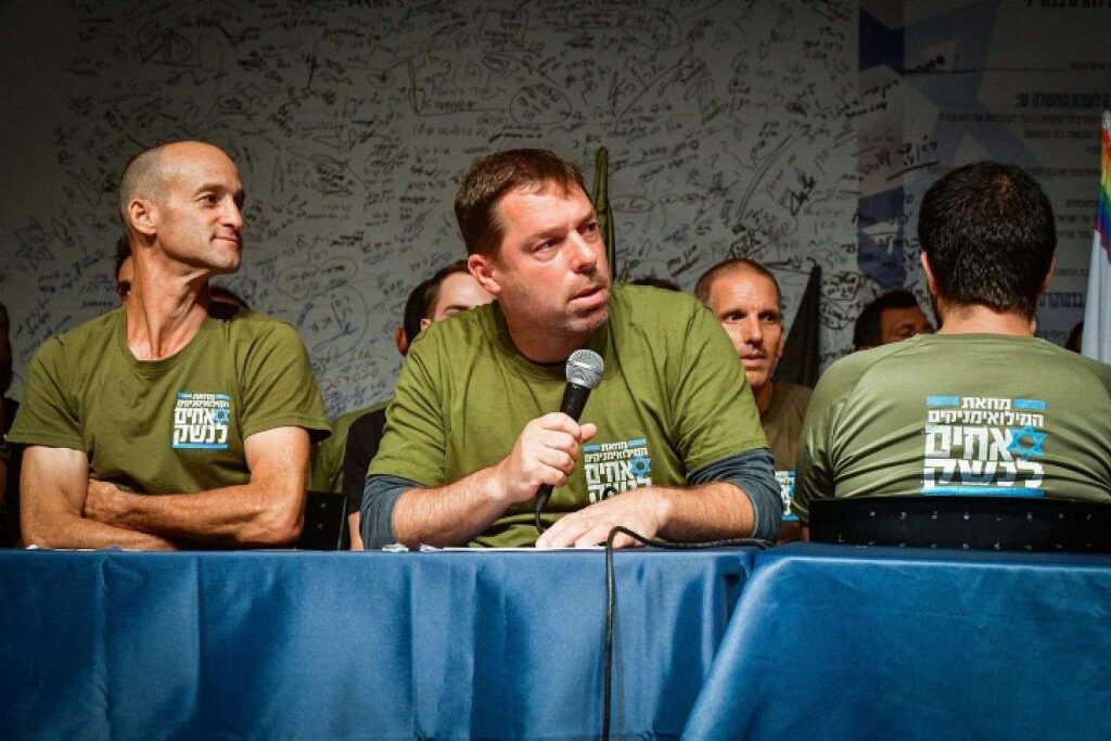 Leden van de “wapenbroeders” en Israëlische reservesoldaten geven een persconferentie in Herzliya, 22 juli 2023. Foto Avshalom Sassoni/Flash90