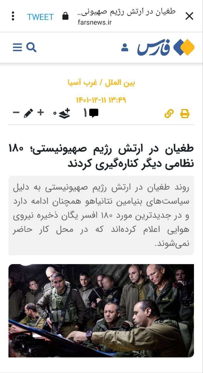 Vooral sinds de regeringswisseling in Israël en het binnenlandse geschil over rechtsvormen hebben de mensen onder het volk de moed verloren. Iedereen waarschuwt voor het ergste en onze Arabische vijanden weten dit met alle liefde uit te buiten. Arabische bronnen citeren woord voor woord uit de Israëlische media hoe politici en officieren onder het volk de politieke situatie beoordelen. De huidige situatie is zeer bemoedigend voor Israëls aartsvijanden. Uit de Israëlische media krijgen zij de indruk dat het Israëlische leger uit elkaar valt en een dieptepunt heeft bereikt. Ze zien gevechtspiloten praten over weigeringen, evenals officieren van de 8200 cybereenheid en andere speciale eenheden. Je ziet voormalige stafchefs en andere generaals die direct of indirect oproepen tot het weigeren van orders.