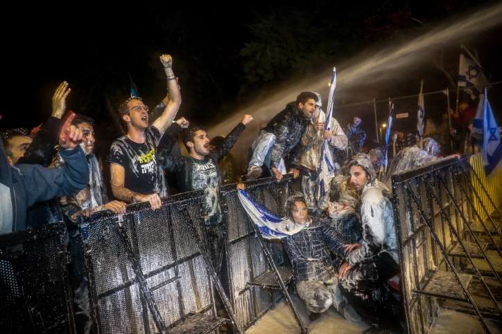 Israëliërs protesteren tegen de geplande hervorming van de rechterlijke macht door de Israëlische regering buiten de residentie van premier Benjamin Netanyahu in Jeruzalem op 26 maart 2023. Foto Noam Revkin Fenton/Flash90