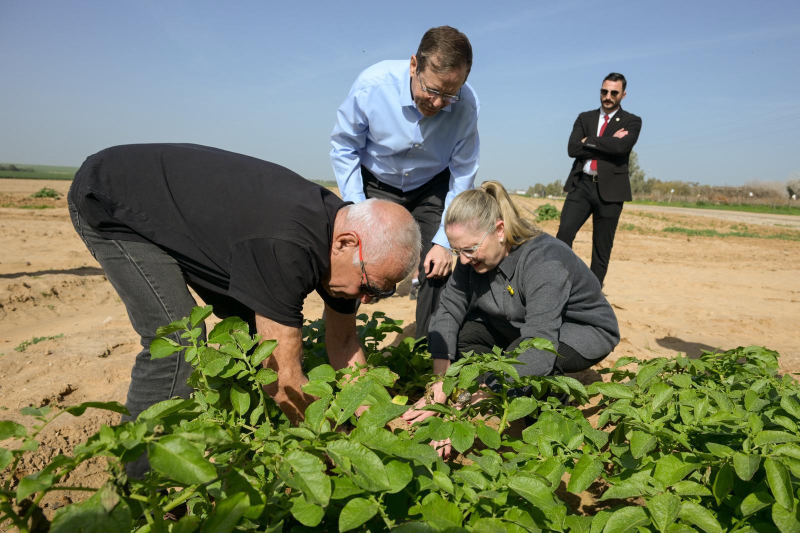 Van daaruit leidde de rondleiding naar het centrum van Gadi Mozes’ werk: de aardappelvelden. Op de velden waarvan de boeren van de kibboets leven en die decennialang zijn karakter hebben bepaald, pauzeerden de president en zijn vrouw samen met Mozes en luisterden ze naar uitleg over de terugkeer naar het landbouwwerk. Een dagelijkse strijd om opnieuw te zaaien en te oogsten – ook al draagt de aarde nog steeds de sporen van de strijd. Het veld waar Mozes na zijn terugkeer uit gevangenschap voor vocht om opnieuw te mogen bewerken, werd een symbool.