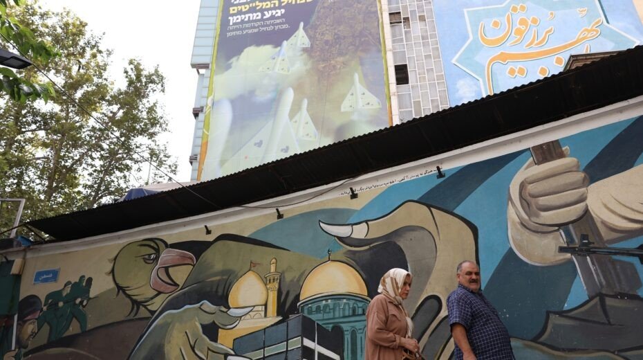 Een anti-Israëlische poster met Iraanse drones en het Perzische opschrift "Tel Aviv zal vanaf nu niet langer veilig zijn" hangt aan een muur op het Palestina-plein in Teheran, Iran, op 31 juli 2024. Afbeelding: EPA-EFE/ABEDIN TAHERKENAREH