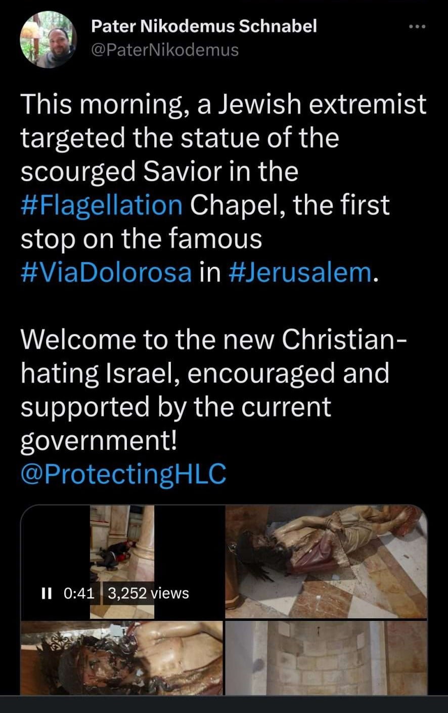 “Een joodse extremist vernielde het beeld van de gegeselde Verlosser in de Kapel van de Flagellatie bij de Eerste Statie op de beroemde Via Dolorosa in Jeruzalem. Welkom in het nieuwe christenhatende Israël, aangemoedigd en gesteund door de nieuwe regering.” Dat waren zijn woorden.