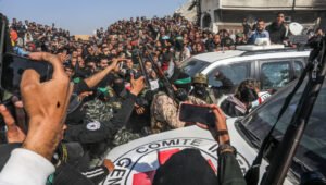 “Ik roep de bemiddelaars op om ervoor te zorgen dat zulke vreselijke taferelen zich niet herhalen,” zei de Israëlische premier nadat een menigte in Gaza de gijzelaars had lastiggevallen.