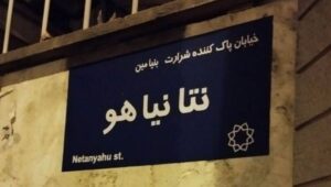De Israëlische premier werd op het tijdelijke verkeersbord beschreven als een redder van het kwaad.