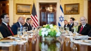 Tijdens een ontmoeting met Mike Johnson, voorzitter van het Huis van Afgevaardigden, in het Capitool, een dag na zijn gesprekken met de Amerikaanse president Donald Trump, bevestigt de Israëlische premier dat de betrekkingen tussen Washington en Jeruzalem nog nooit zo hecht zijn geweest.